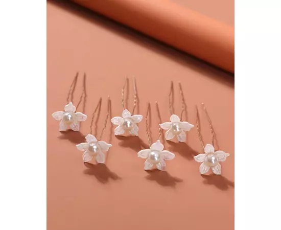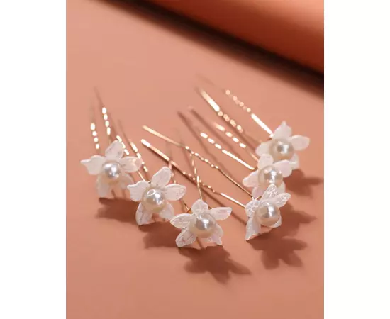 Ace Par Mireasa, Model cu flori albe si perle 7 x 2 cm, Aurii - 6buc