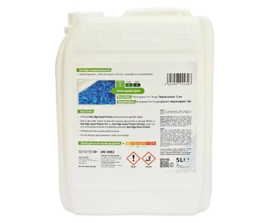 Anti-Alge Green Protect se utilizeaza pentru a preveni aparitia algelor in piscina. In cazul in care apa devine verde, invazia de alge este prezenta. Apa piscinei se trateaza eficient cu Anti-Alge Green Protect Pro sau Anti-Alge Green Protect Extreme, dupa care este recomandata revenirea la tratamentul preventiv cu Anti-Alge Green Protect. Mentineti apa in parametrii chimici recomandati!