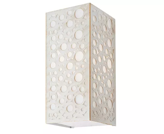 Aplica este un corp de iluminat pentru exterior realizata din policarbonat opal cu parte frontala din metal traforat cu finisaj alb mat cu patina aurie.