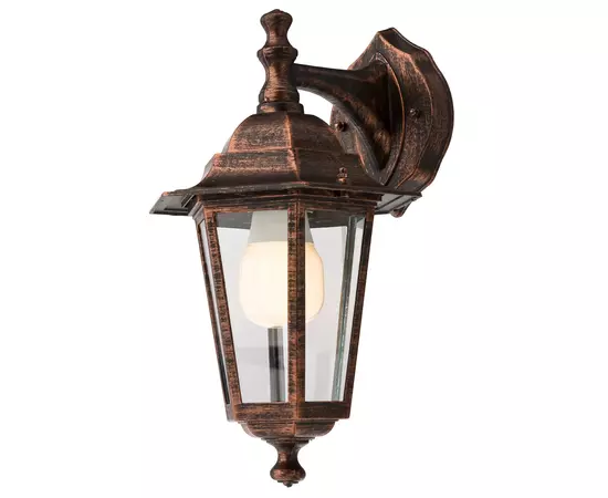 Aplica pentru exterior este confectionata in stil clasic, din aluminiu turnat sub presiune, finisaj negru cu patina cupru, cu dispersor din sticla, orientat in jos. Acest corp de iluminat este potrivit cu precadere in decorurile retro, datorita designului, materialelor si culorilor folosite.