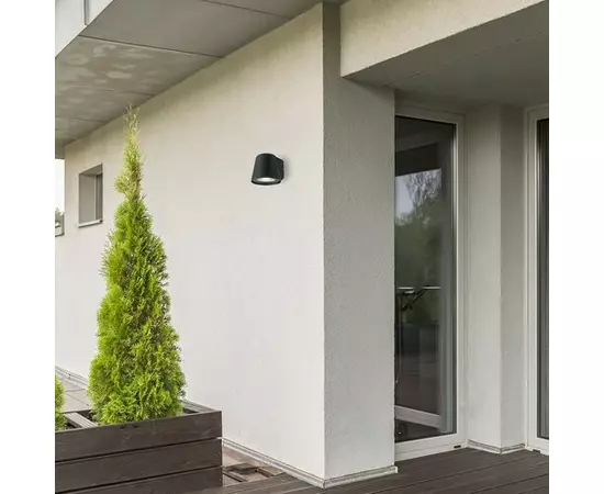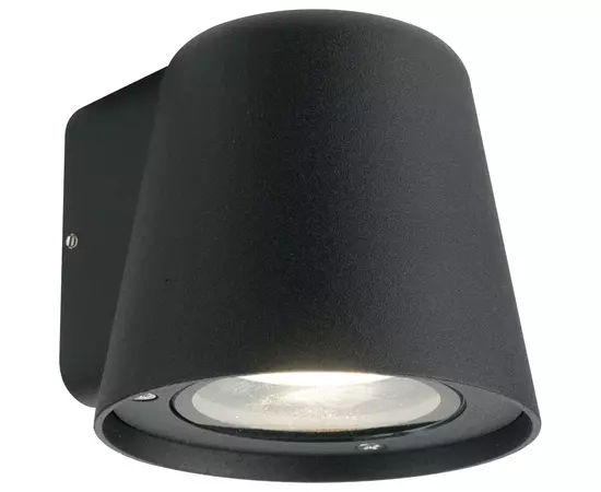Aplica de perete este un corp de iluminat realizat din aluminiu de culoare neagra ce se lateste in partea de jos si este completata de un dispersor din sticla transparenta. Modelul care lumineaza in jos va fi o alegere practica pentru peretele exterior al casei, oferind, in acelasi timp, un aspect modern.