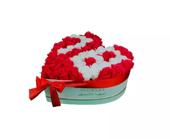 Aranjament floral 18 inima cu 49 trandafiri parfumati de sapun rosii si albi