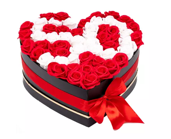 Aranjament Floral Trandafiri Sapun - Cutie Inima Cifra (orice cifra) 53 Trandafiri Rosu cu Alb