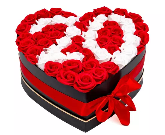 Aranjament Floral Trandafiri Sapun - Cutie Inima 53 Trandafiri Rosu si Alb