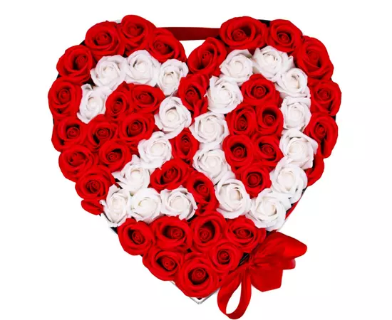 Aranjament Floral Trandafiri Sapun - Cutie Inima Cifra(orice cifra) 53 Trandafiri Rosu si Alb - VLTN111