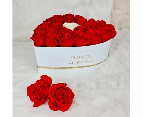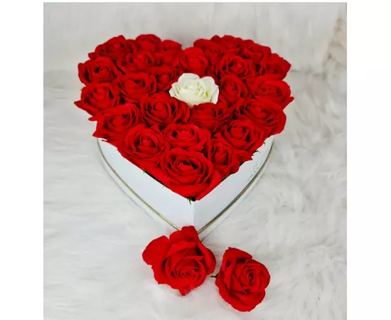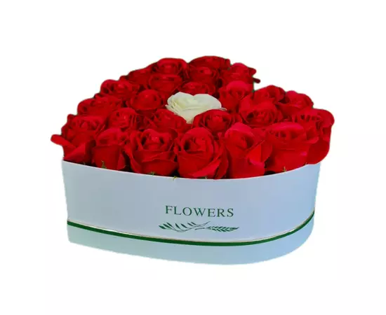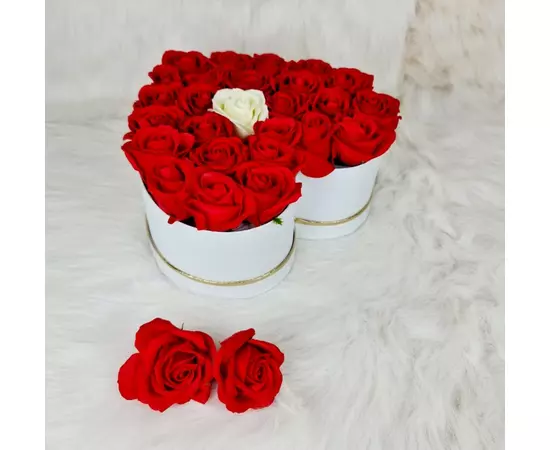 Aranjament Floral Trandafiri Sapun - Cutie Inima 41 Trandafiri Rosu cu Alb