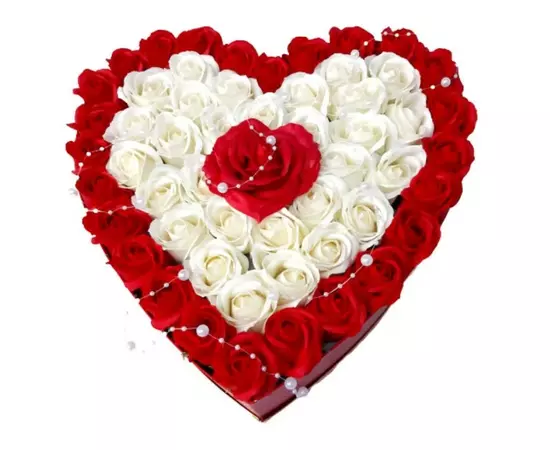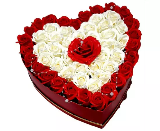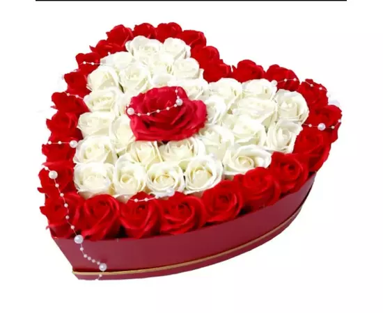 Aranjament Floral Trandafiri Sapun - Cutie Inima 55 Trandafiri Rosii