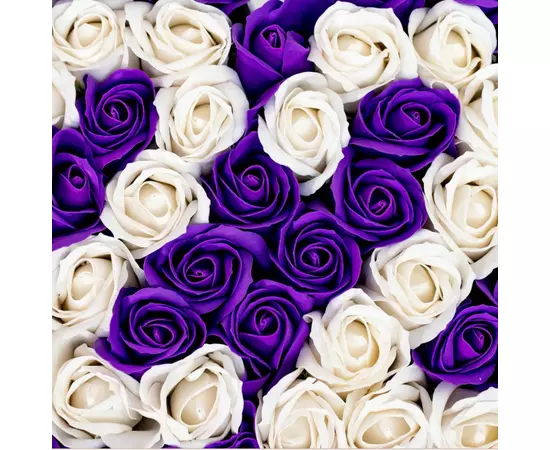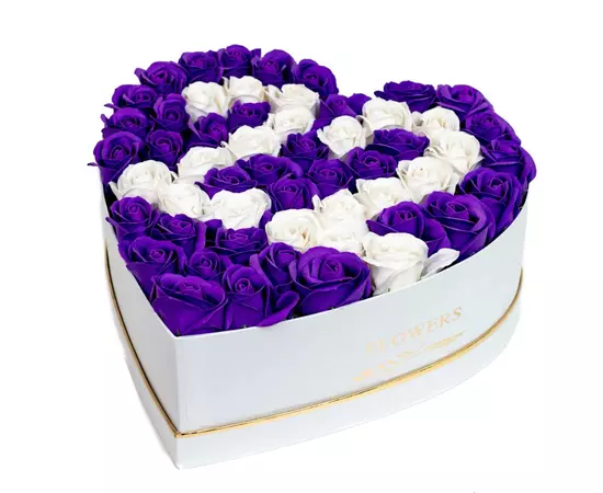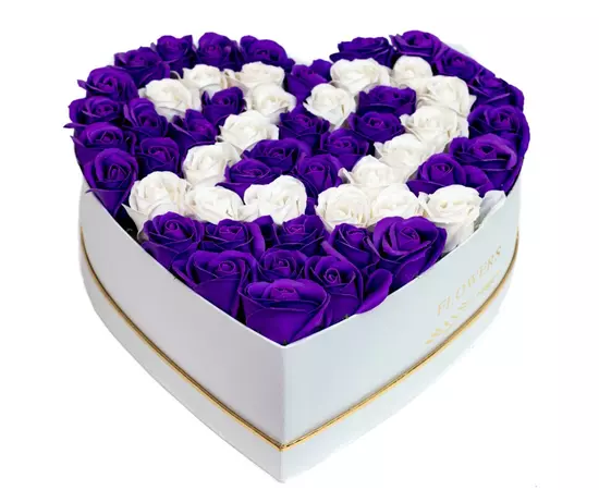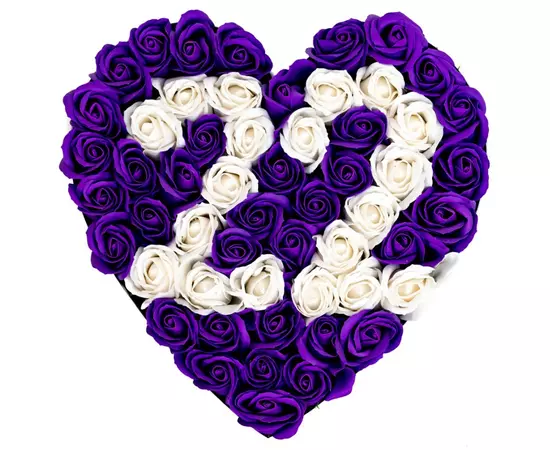 Aranjament Floral Trandafiri Sapun - Cutie Inima Cifra (orice cifre) 55 Trandafiri Albastru cu Alb - VLTN119