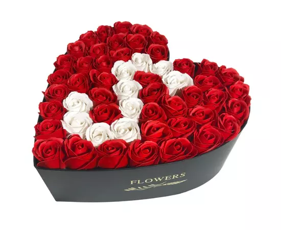Aranjament Floral Trandafiri Sapun - Cutie Inima Litera A (orice litera) 41 Trandafiri Rosu cu Alb