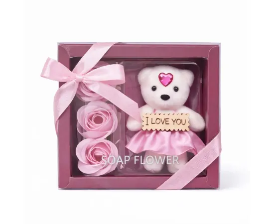 Aranjament Floral Trandafiri Roz+Ursuleț 14x14x4.5cm - KRMS103