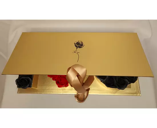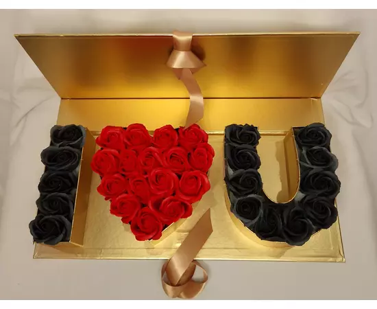 Aranjament Floral Trandafiri Sapun - Cutie I Love You Gold 33 Trandafiri Rosu cu Negru