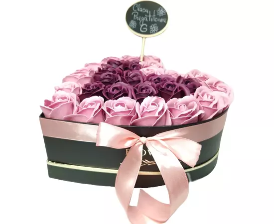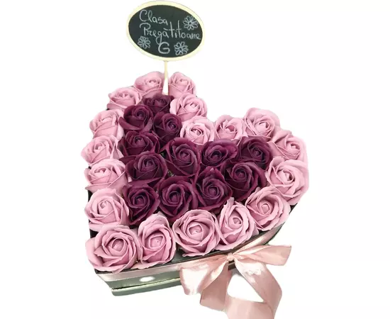 Aranjament Floral Trandafiri Sapun - Cutie Inima 31 Trandafiri Roz cu Visiniu