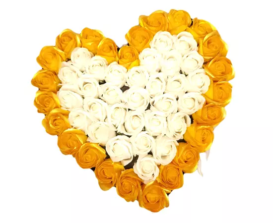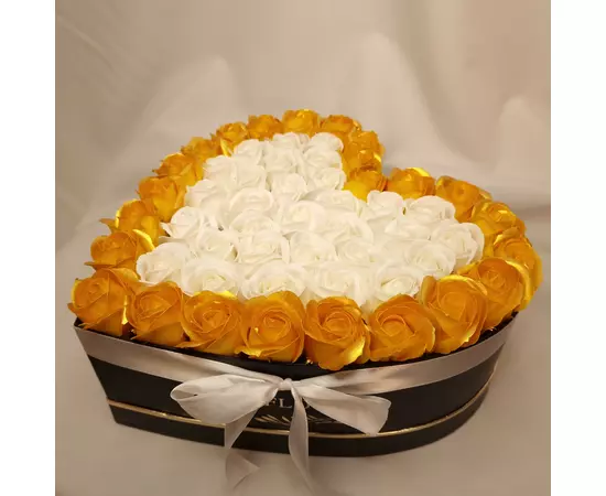 Aranjament Floral Trandafiri Sapun - Cutie Inima 53 Trandafiri Gold si Alb