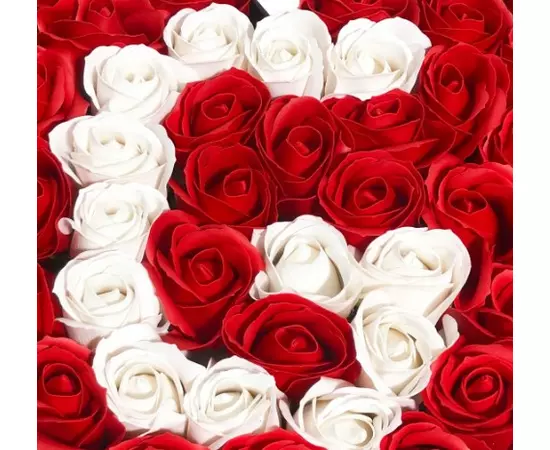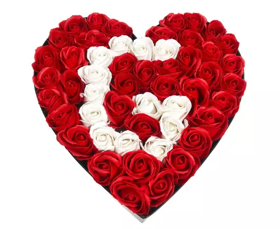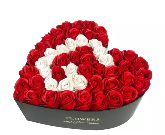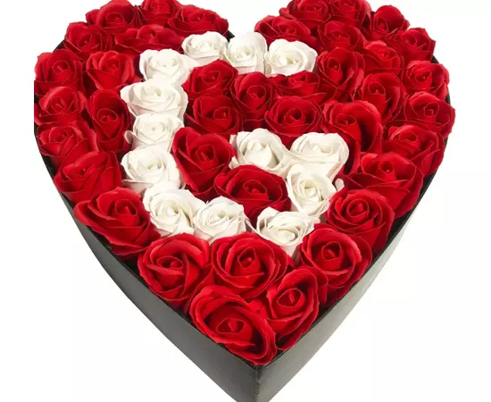 Aranjament Floral Trandafiri Sapun - Cutie Inima Litera (orice litera) 49 Trandafiri Rosu cu Alb - VLTN127
