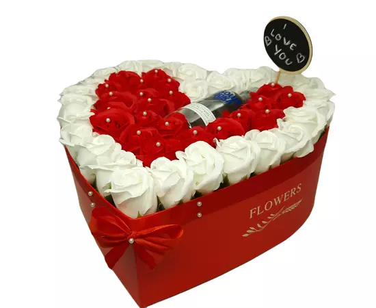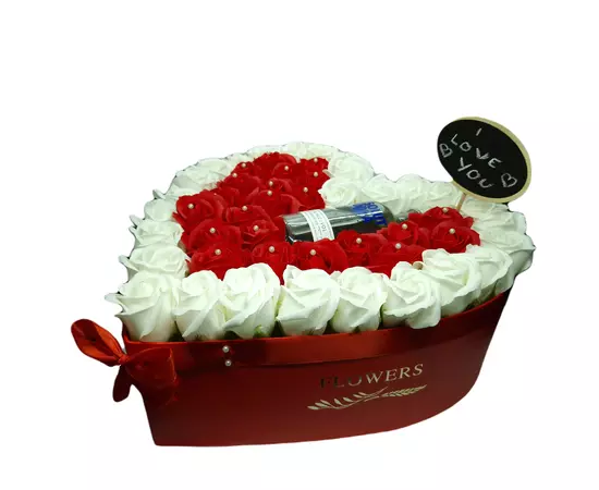Aranjament Floral Trandafiri Sapun - Cutie Inimioara Rosu si Alb cu Bautura 51 Trandafiri
