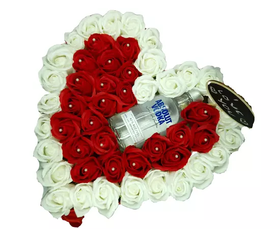Aranjament Floral Trandafiri Sapun - Cutie Inimioara Rosu si Alb cu Bautura 51 Trandafiri - VLTN122