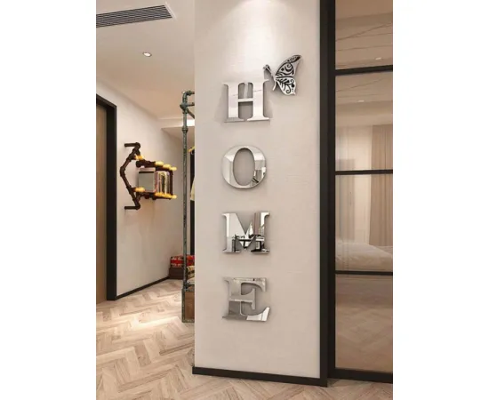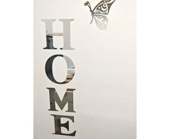 Textul “Home” este redat cu un font modern, realizat din oglindă acrilică, oferind adâncime, reflexii elegante și o estetică contemporană, ideală pentru holuri și intrări.
