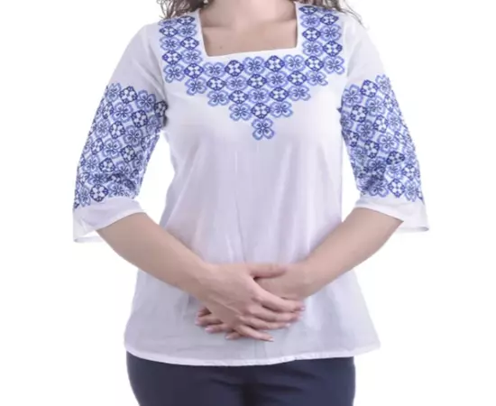 Bluza tip ie alba din bumbac cu maneca 3/4 clopot si motiv albastru.