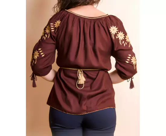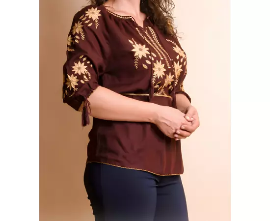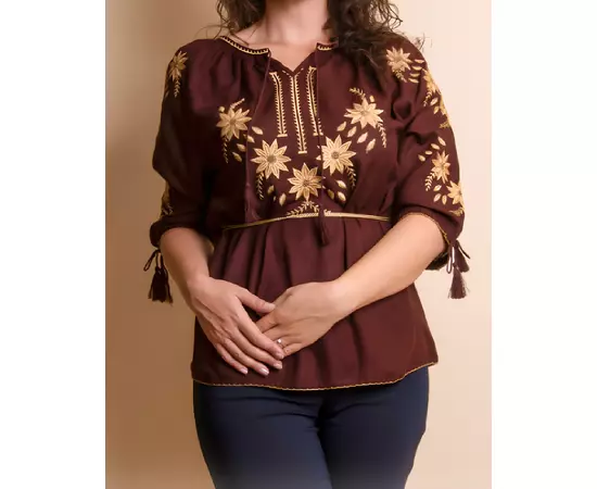 Bluza tip ie maro din celofibra cu maneca 3/4 si motiv floral auriu