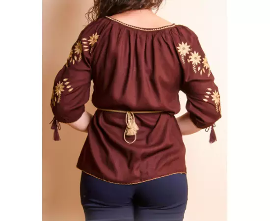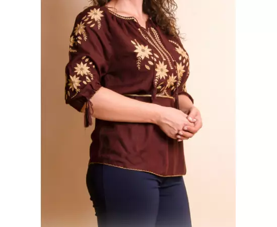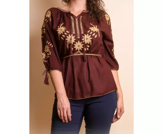 Bluza tip ie maro din celofibra cu maneca 3/4 si motiv floral auriu