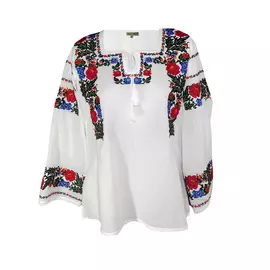 Bluza tip ie alba din bumbac cu maneca lunga si motiv floral multicolor.