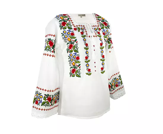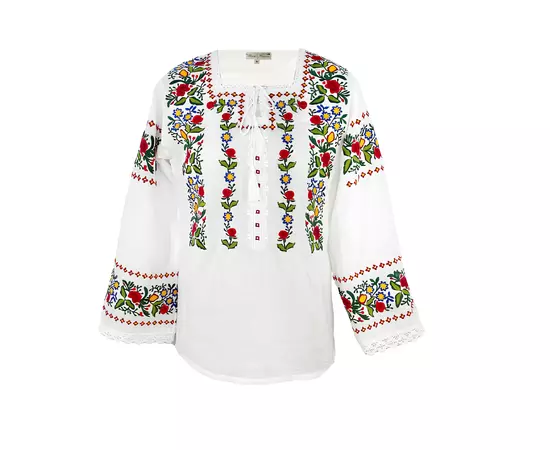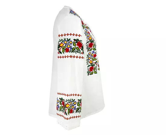 Bluza tip ie alba din bumbac cu maneca lunga si motiv floral multicolor.