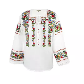 Bluza tip ie alba din bumbac cu maneca lunga si motiv floral multicolor.