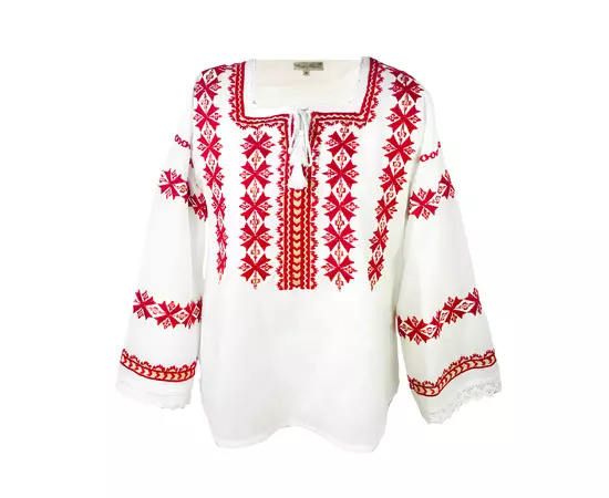 Bluza tip ie alba din bumbac cu maneca lunga si motiv geometric rosu.
