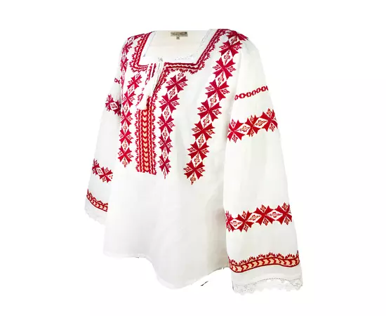 Bluza tip ie alba din bumbac cu maneca lunga si motiv geometric rosu.