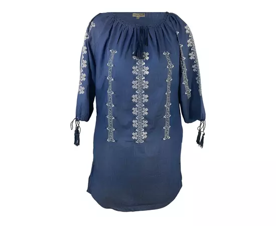 Bluza tip ie albastra din bumbac cu maneca 3/4 cu nasture si motiv geometric alb.