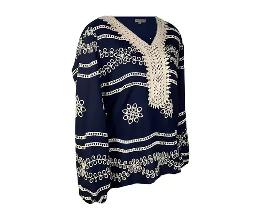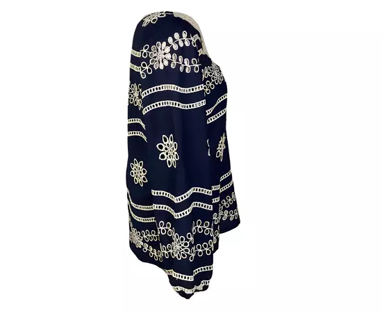 Bluza bleumarin din viscoza cu maneca lunga cu perforatii si motiv floral crem.