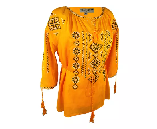 Bluza tip ie galbena din viscoza cu maneca 3/4 si motiv geometric multicolor. Modelul are inaltimea de 162 cm si poarta marimea S.