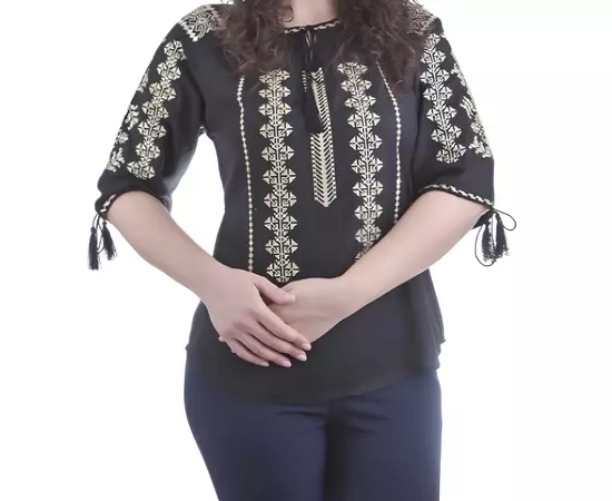 Bluza tip ie neagra din viscoza cu maneca scurta si motiv auriu.