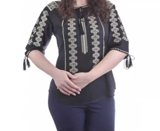 Bluza tip ie neagra din viscoza cu maneca scurta si motiv auriu.