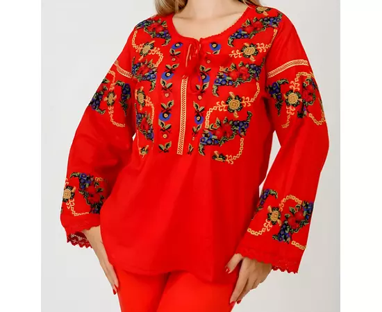 Bluza tip ie rosie din bumbac cu maneca lunga si motiv floral multicolor.