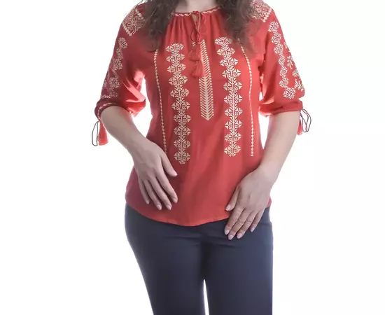 Bluza tip ie rosie din viscoza cu maneca scurta si motiv auriu.