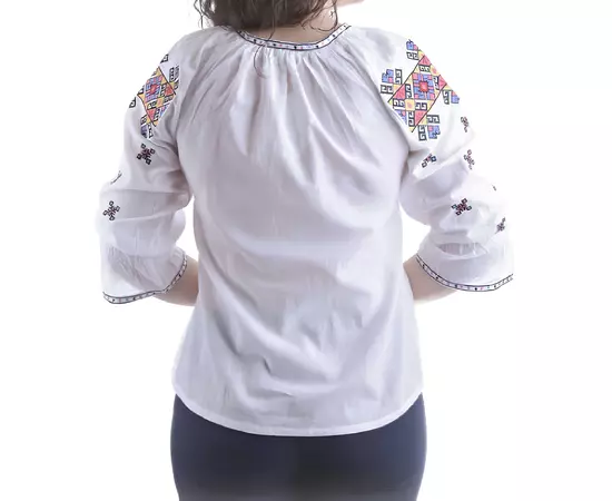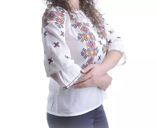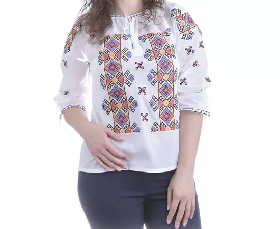 Bluza Tip Ie Traditionala Alba cu Motiv Geometric Multicolor de Dama - IMS91