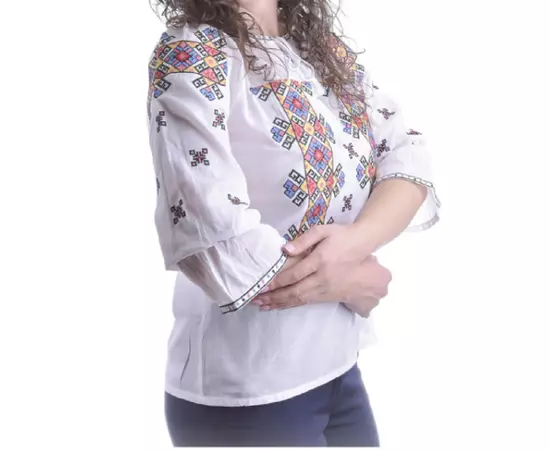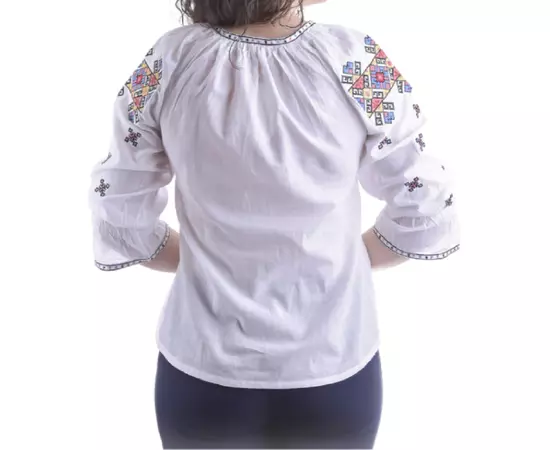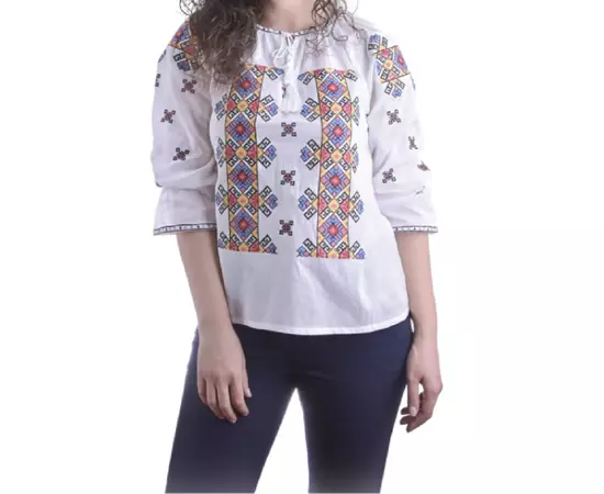 Bluza Tip Ie Traditionala Alba cu Motiv Geometric Multicolor de Dama - IMS91