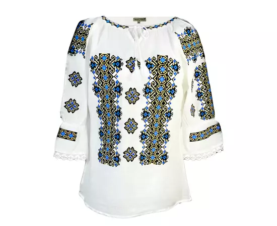 Bluza Tip Ie Traditionala Alba cu Motiv Geometric Albastru de Dama - IMS144