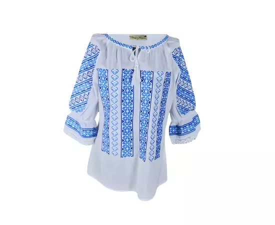 Bluza Tip Ie Traditionala Alba cu Motiv Geometric Albastru de Dama - IMS158