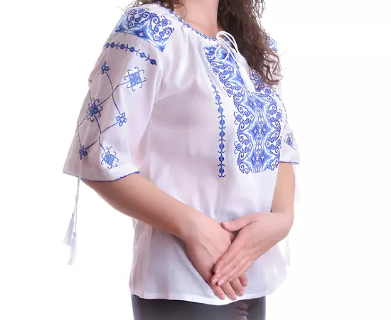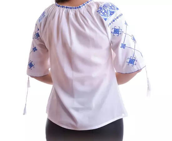 Bluza Tip Ie Traditionala Alba cu Motiv Geometric Albastru de Dama - IMS67