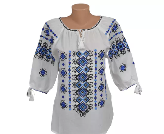 Bluza Tip Ie Traditionala Alba cu Motiv Geometric Albastru de Dama - IMS70