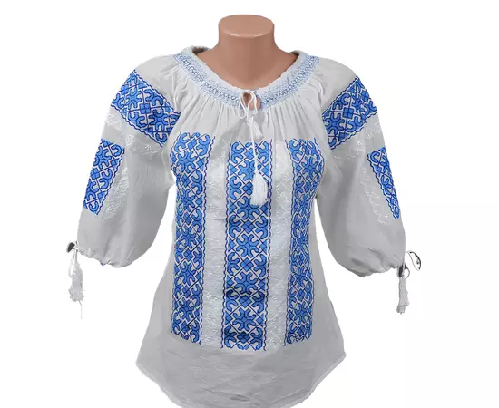 Bluza Tip Ie Traditionala Alba cu Motiv Geometric Albastru de Dama - IMS76