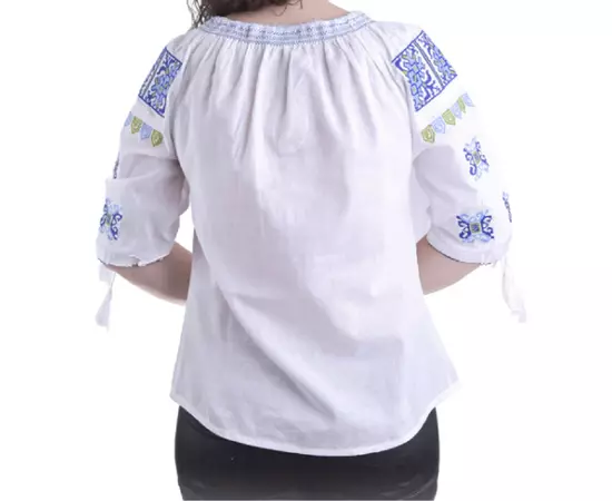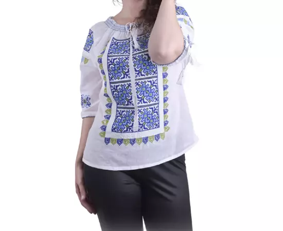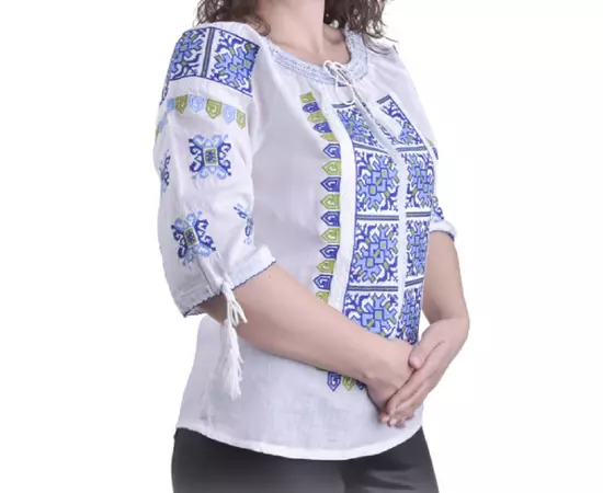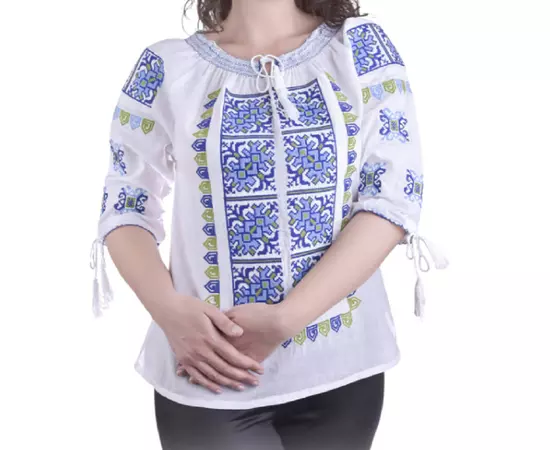 Bluza Tip Ie Traditionala Alba cu Motiv Geometric Albastru de Dama - IMS97