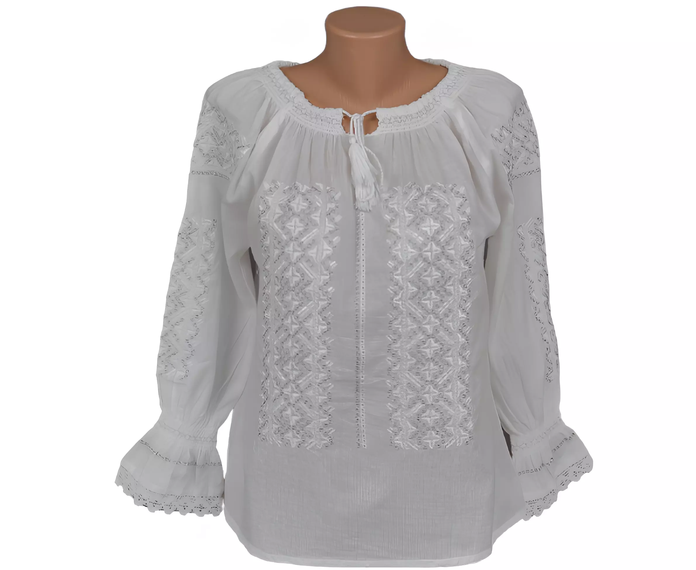 Bluza Tip Ie Traditionala Alba cu Motiv Geometric Argintiu de Dama - IMS117