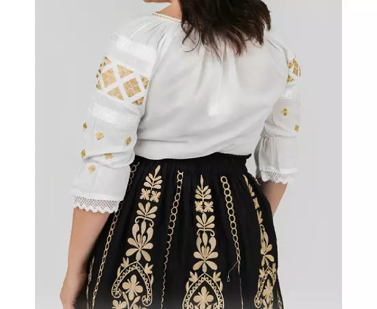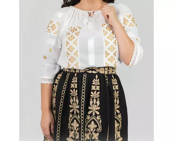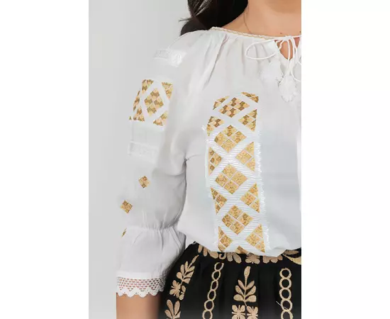 Bluza Tip Ie Traditionala Alba cu Motiv Geometric Auriu de Dama - IMS143