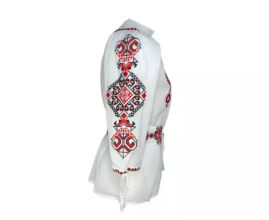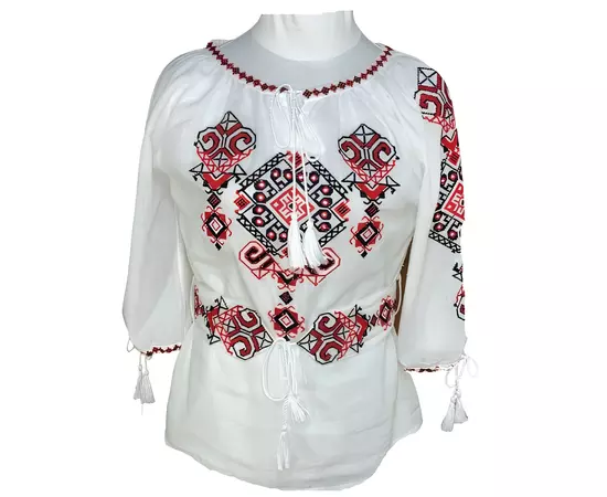 Bluza Tip Ie Traditionala Alba cu Motiv Geometric Rosu de Dama - IMS89