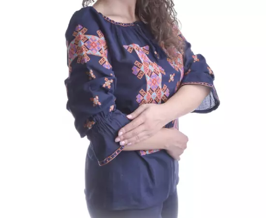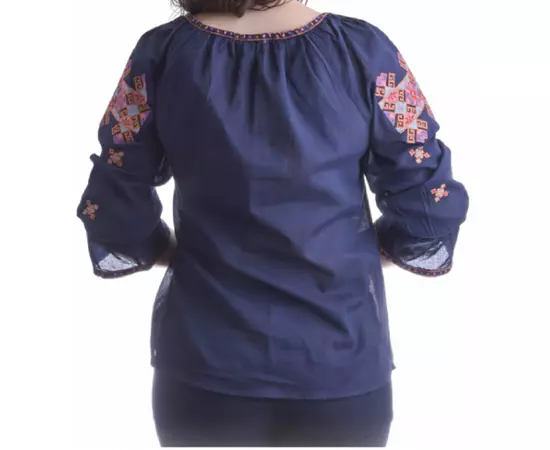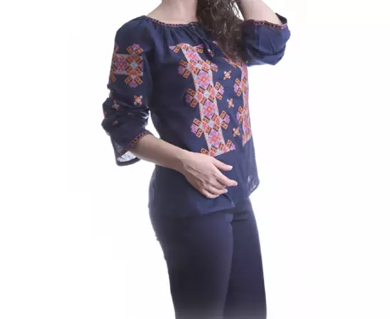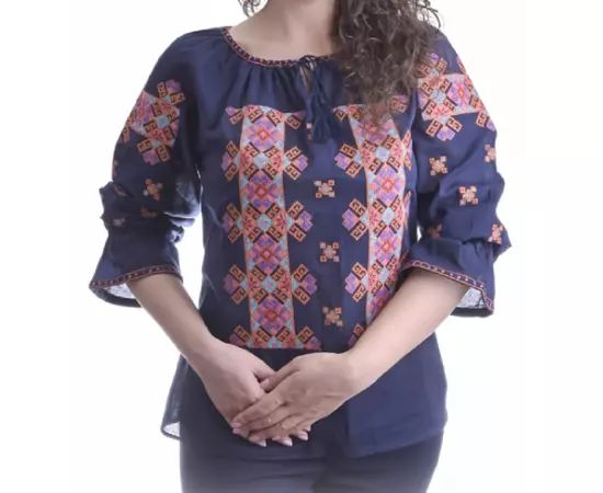 Bluza Tip Ie Traditionala Albastra cu Motiv Geometric Multicolor de Dama - IMS92