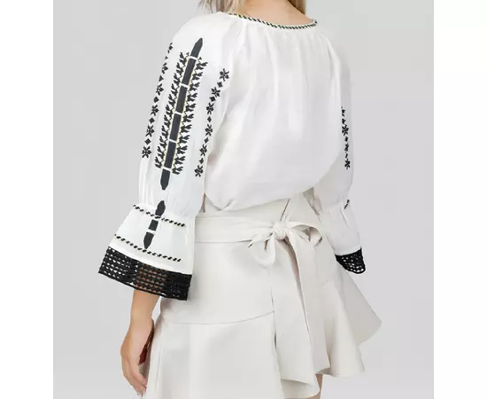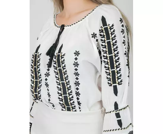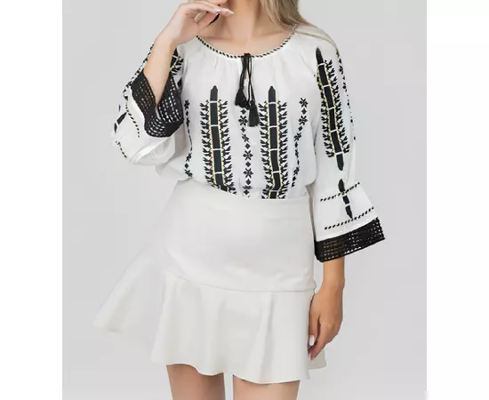 Bluza Tip Ie Traditionala Alba cu Motiv Geometric Negru de Dama - IMS63
