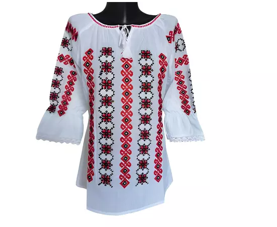 Bluza Tip Ie Traditionala Alba cu Motiv Geometric Rosu de Dama - IMS125